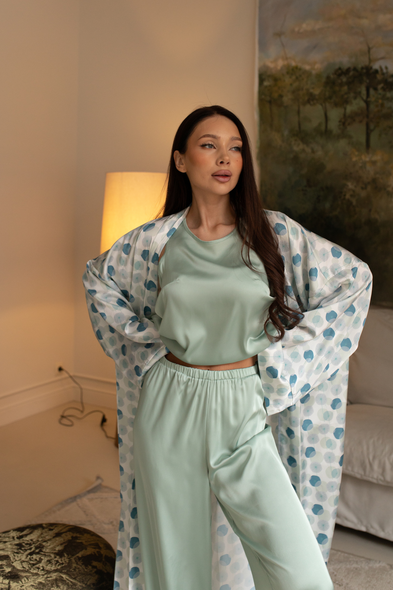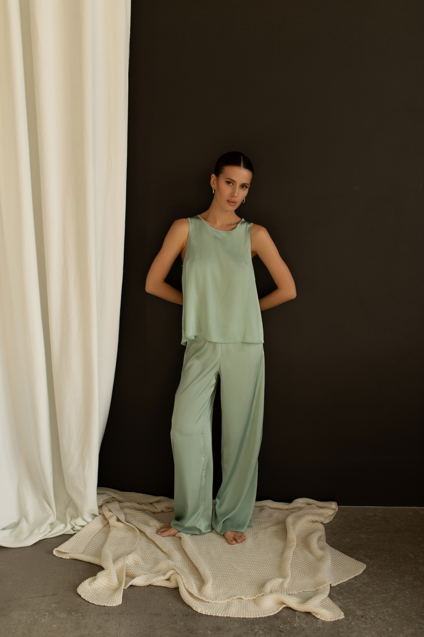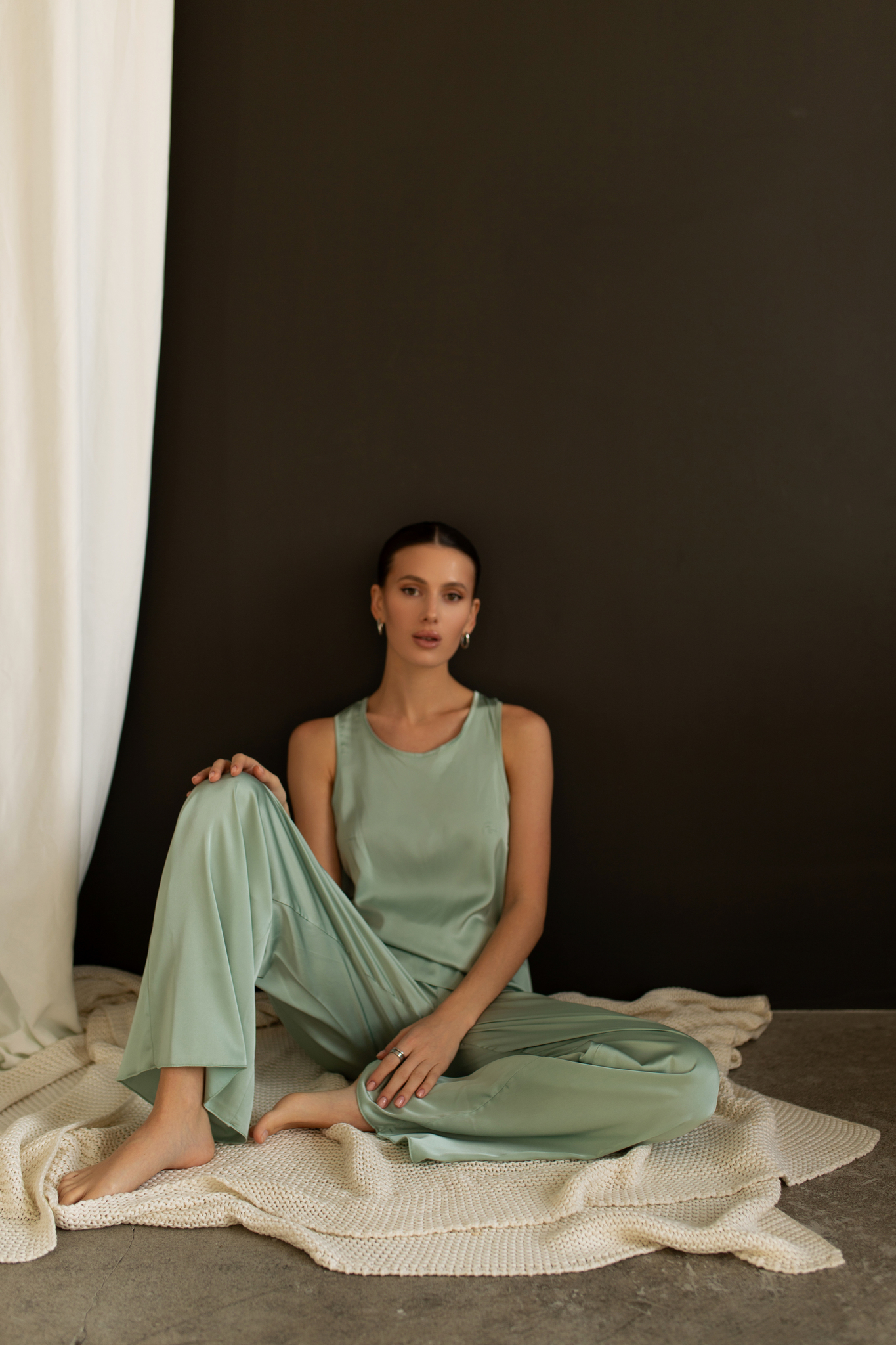 Легкий комплект из мягкого сатина – идеален для отдыха и домашнего уюта! Удобная майка А-силуэтa с широкими бретелями подчеркивает женственность, а декоративные элементы придают элегантности. Прямые брюки с удобной эластичной тесьмой на талии обеспечивают свободу движений. Создай атмосферу комфорта и стиля дома уже сегодня!